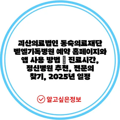 괴산의료법인 동숙의료재단 벧엘기독병원 예약 홈페이지와 앱 사용 방법 | 진료시간, 정신병원 추천, 전문의 찾기, 2025년 일정