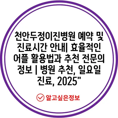 천안두정이진병원 예약 및 진료시간 안내| 효율적인 어플 활용법과 추천 전문의 정보 | 병원 추천, 일요일 진료, 2025″