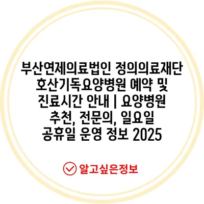 부산연제의료법인 정의의료재단 호산기독요양병원 예약 및 진료시간 공지 | 요양병원 추천, 전연락, 일요일 공휴일 운영 정보 2025 에 대해 자주 묻는 질문 TOP 5