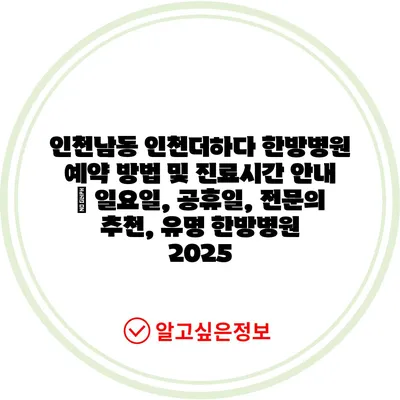 인천남동 인천더하다 한방병원 예약 방법 및 진료시간 공지 | 일요일, 공휴일, 전연락 추천, 유명 한방병원 2025 에 대해 자주 묻는 질문 TOP 5