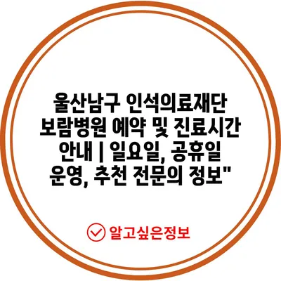 울산남구 인석의료재단 보람병원 예약 및 진료시간 안내 | 일요일, 공휴일 운영, 추천 전문의 정보”